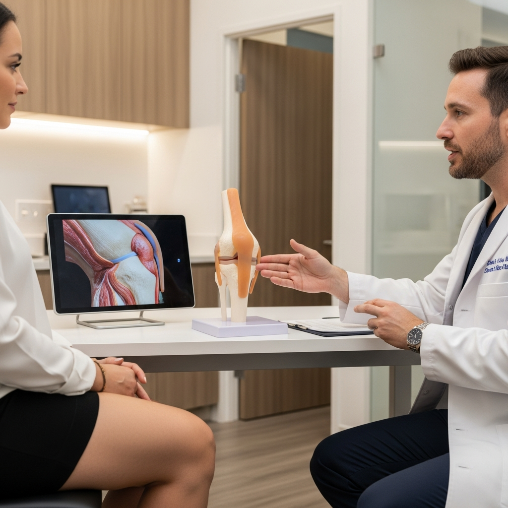 Хирургическое решение начинается не в операционной, а на консультации. Сначала я оцениваю жалобы, анамнез травмы, локализацию боли, наличие отёков, эпизоды блокад и ограничения функции. Затем смотрю ось конечности, стабильность связок, работу надколенника и мышечный контроль.