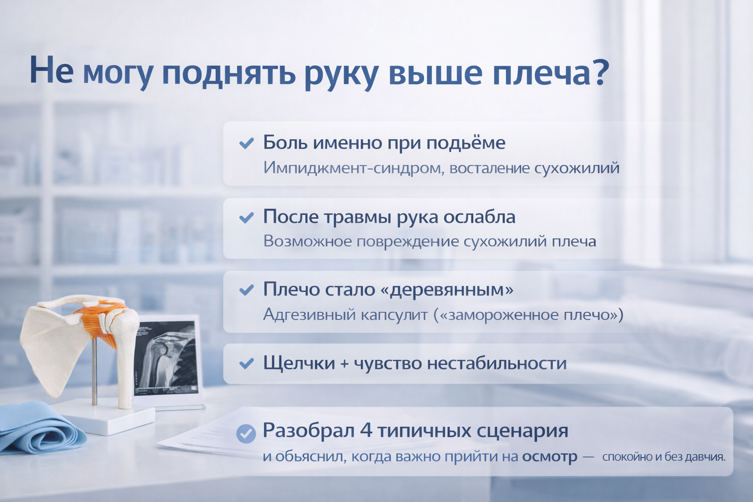 Когда человек говорит «не могу поднять руку выше плеча», за этой фразой может скрываться несколько разных проблем — от воспаления сухожилий до разрыва ротаторной манжеты. По опыту, важно не пытаться угадать диагноз по одному симптому, а понять сценарий: как началось, что именно мешает — боль, слабость или «деревянность» сустава.