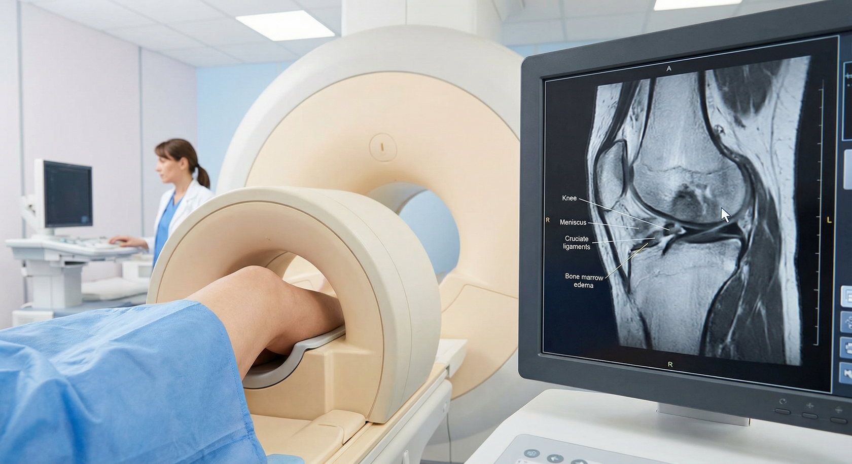 На консультации важнее всего осмотр: тесты на мениски, связки, оценка оси ноги, объёма движений, работы мышц. Дальше — исследования коленного сустава по показаниям.